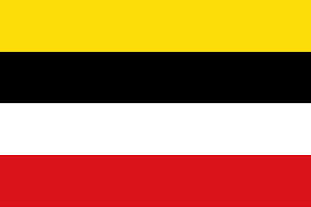 Vier even hoge horizontale banen in de kleuren geel, zwart, wit en rood.